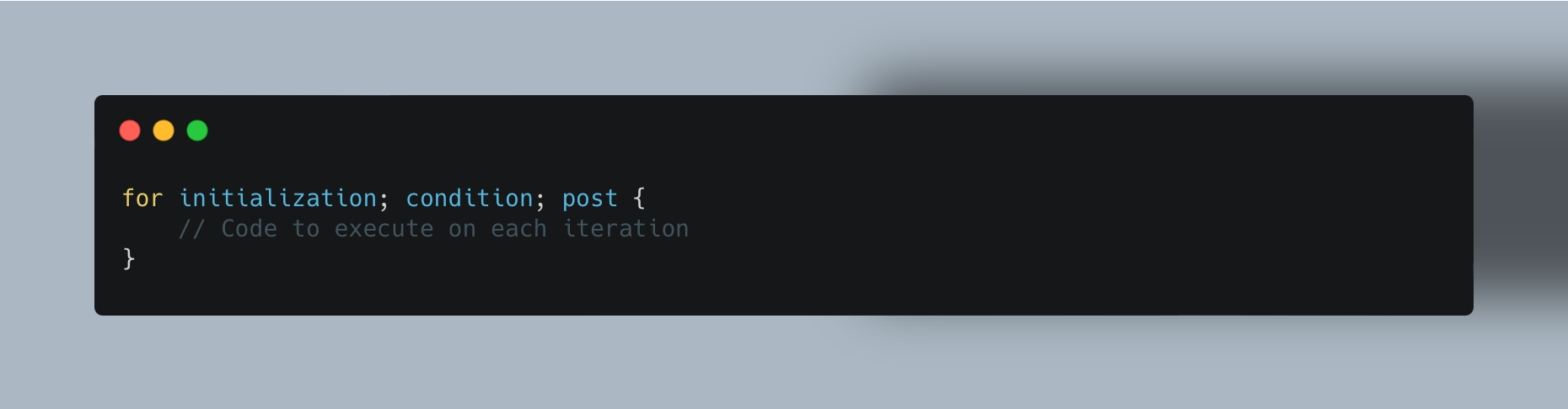 For loops are used to repeat a block of code for a specific number of iterations or until a condition is met. Go has a simple for loop syntax: