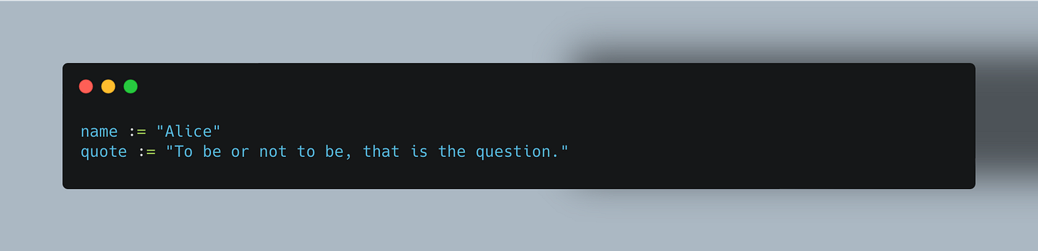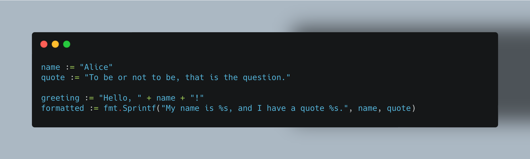 fmt.Sprintf() essentially means, I have a string but parts of it are stored in variables. I can then format the string I have and add placeholders for interpolation in the case of variables. For example in the above case, a real world scenario would be that name and quote are not just static values but inputs from the user. So you wouldn’t know in advance how to construct the string without the input. That’s where the fmt.Sprintf() comes in handy.