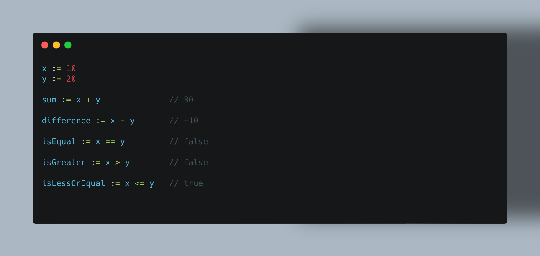 Go has several types of operators that allow you to perform arithmetic, comparisons, and logical operations: