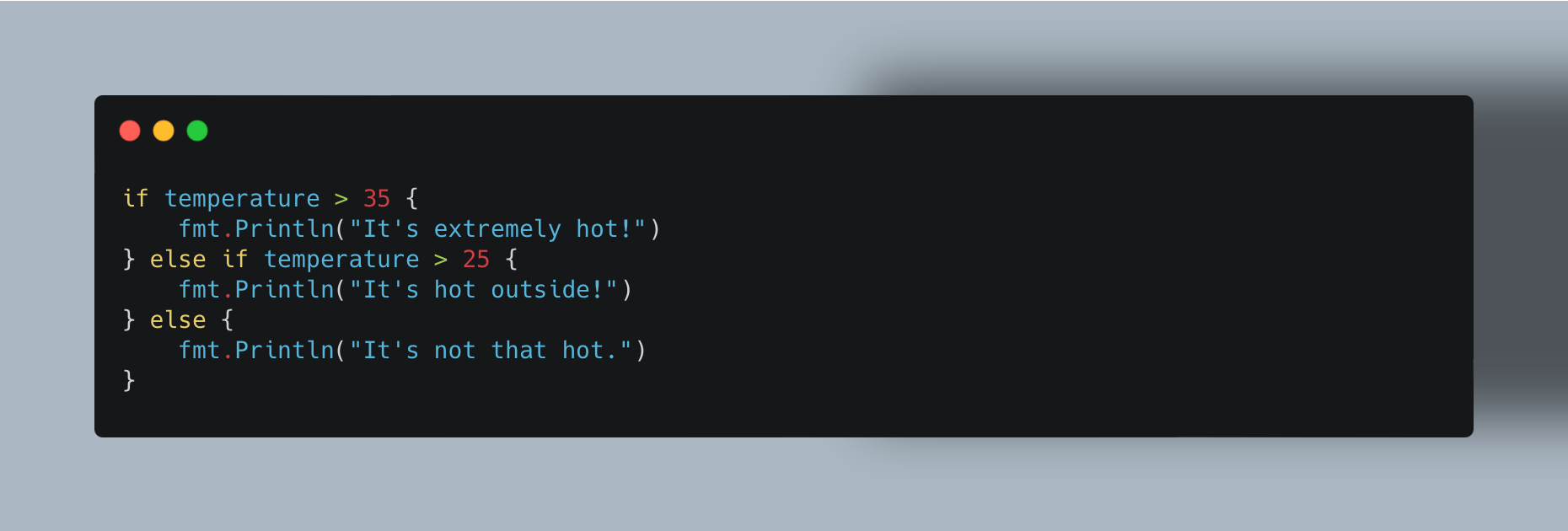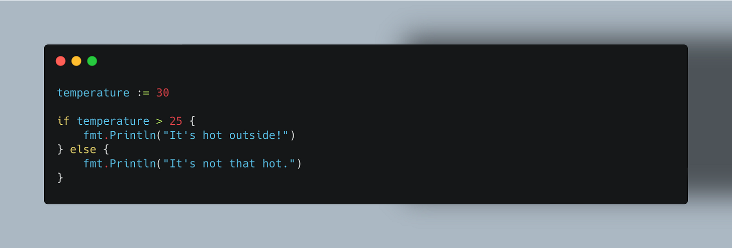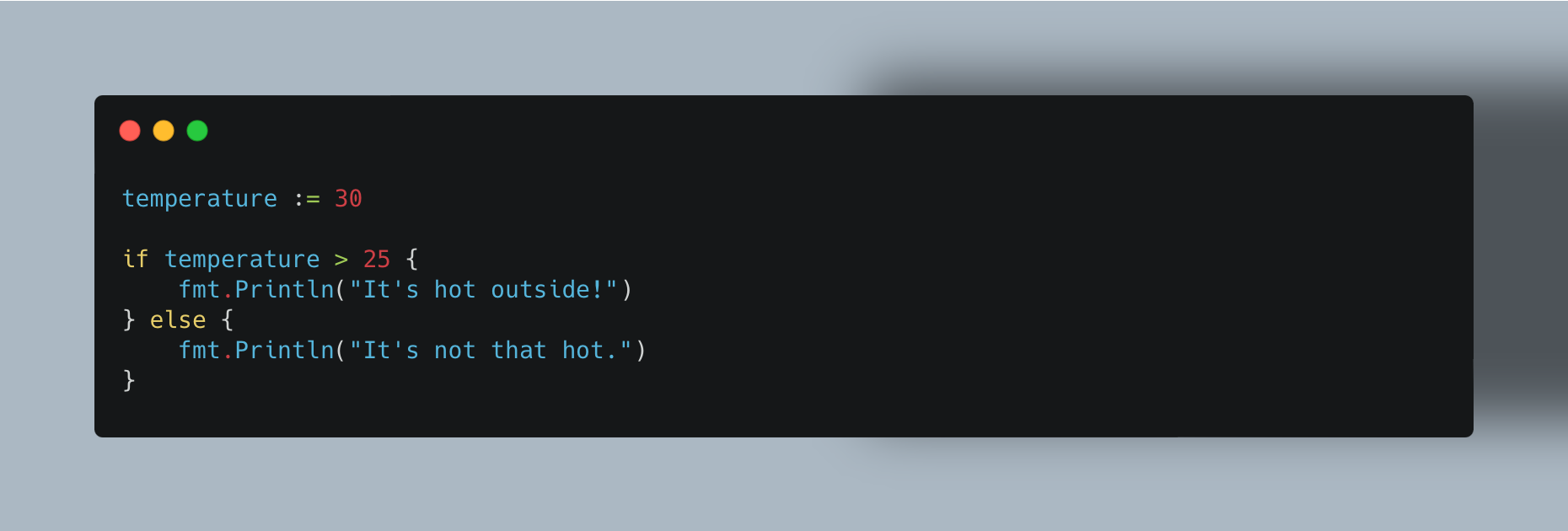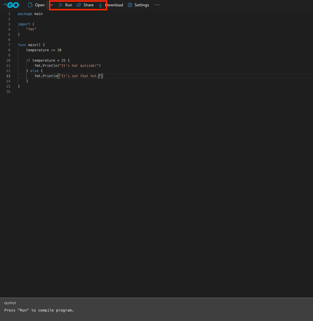 Inside the func main() we can write our code. Let’s write the if/else example we saw earlier:
