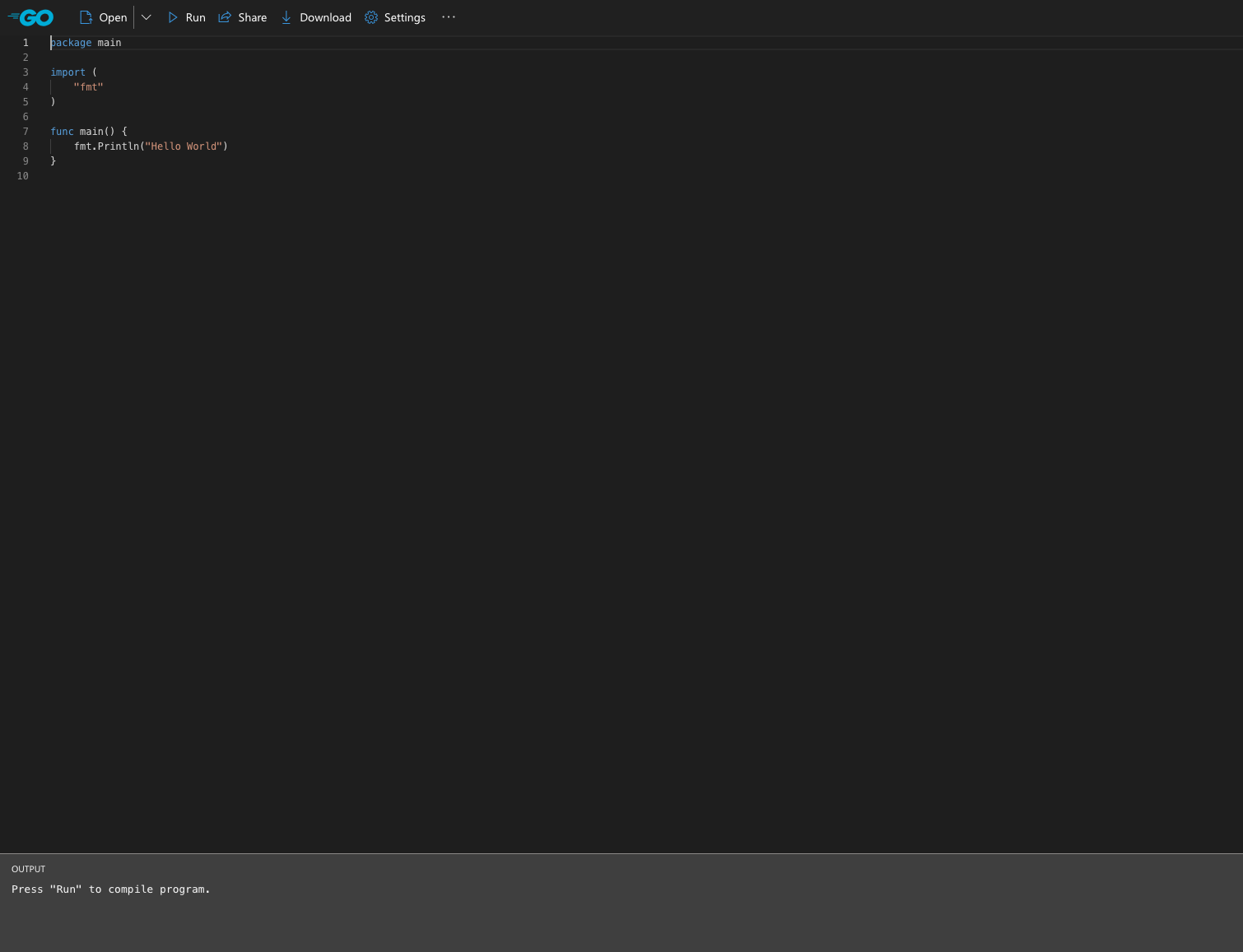 If you hit Run you should see the output in the pane below. Share would allow you to share your snippet with the world! The code above can be found https://goplay.tools/snippet/kFkZioKxKlk.