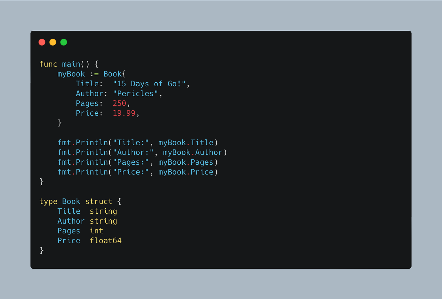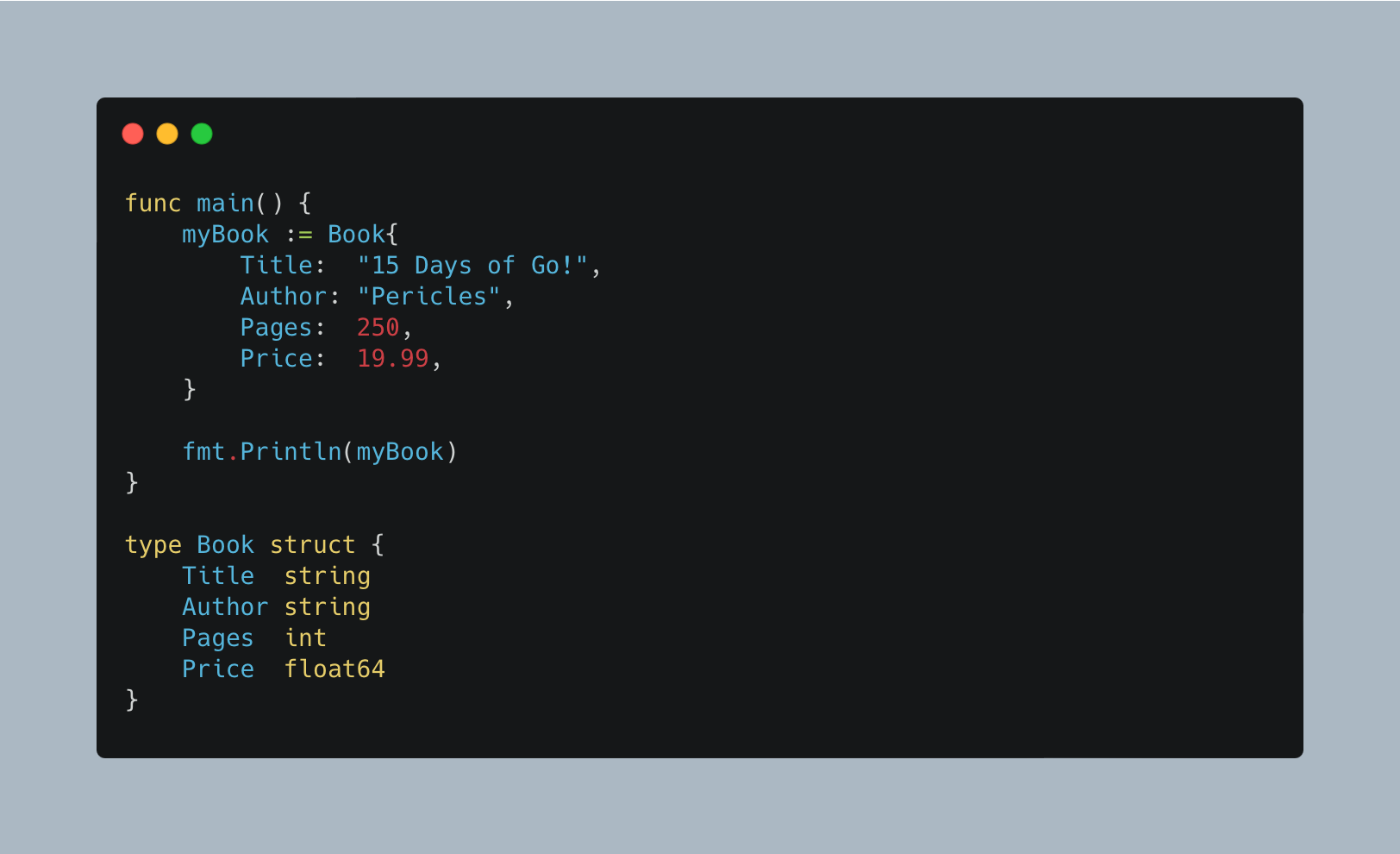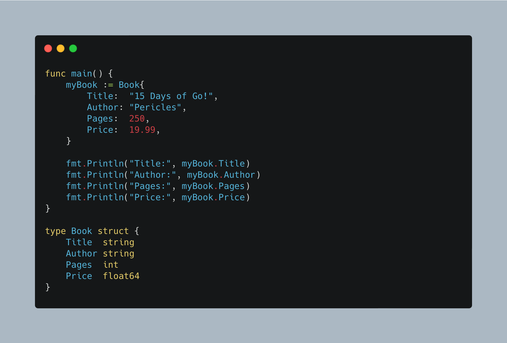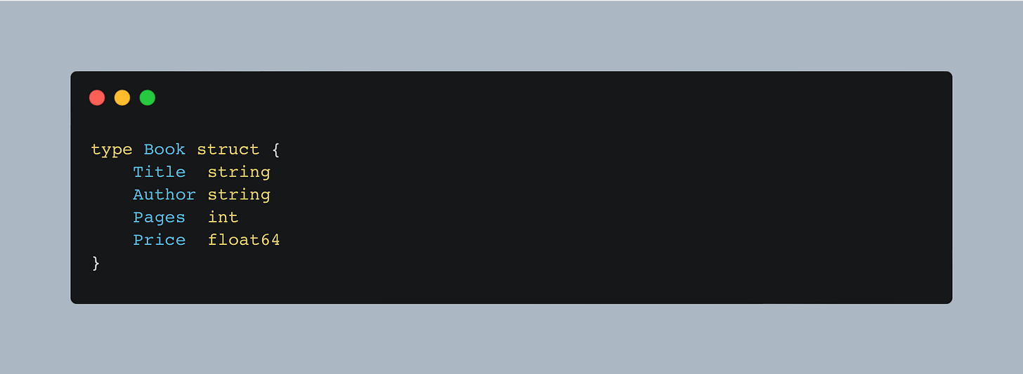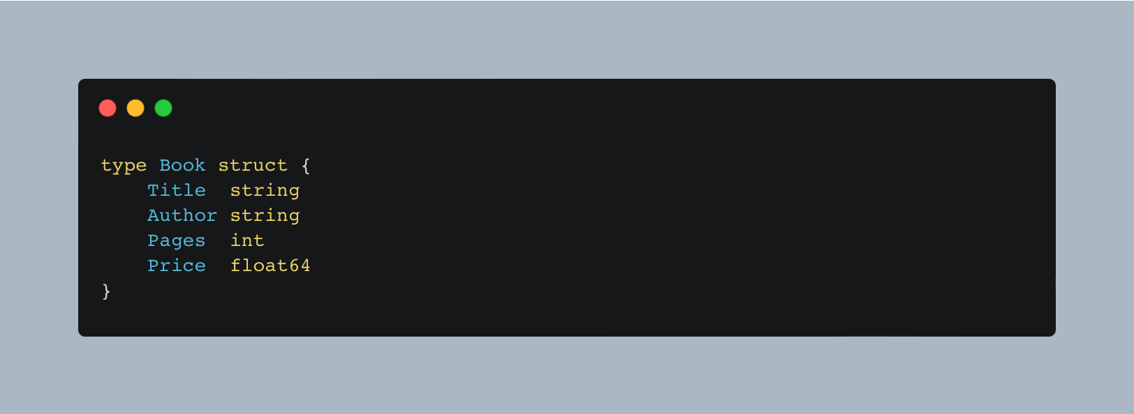 , you'll define the fields and their data types. Let's create a struct to represent a book: