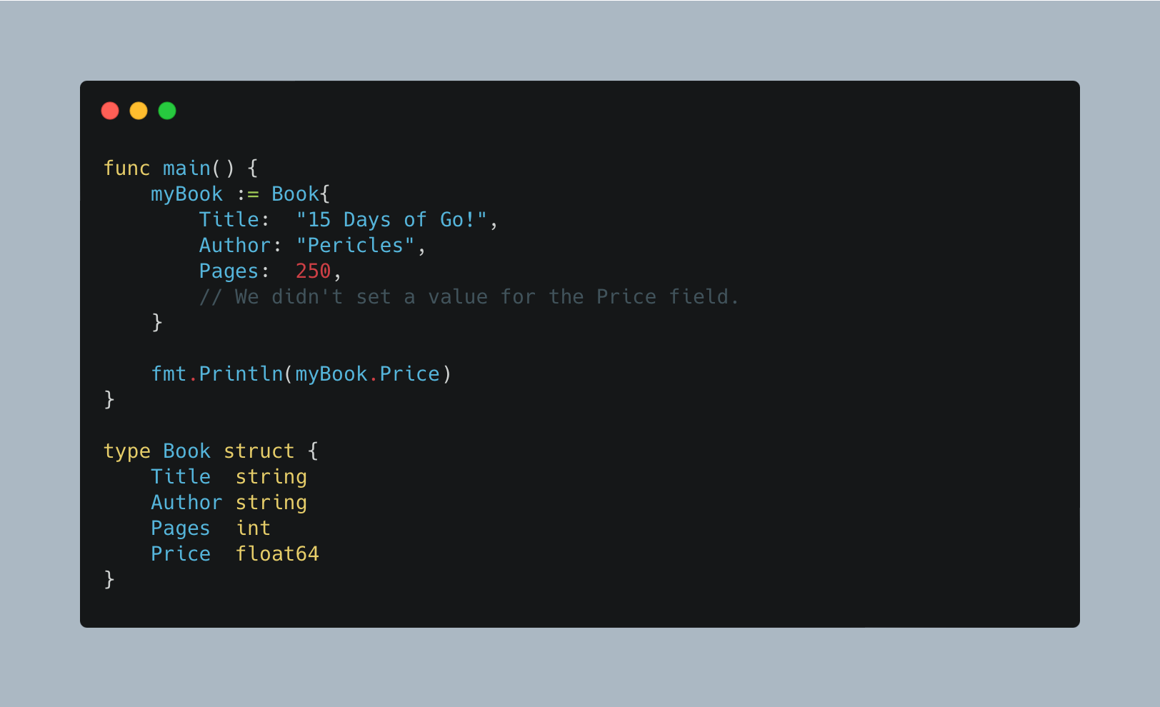 When creating a struct, if you don't provide a value for a field, Go automatically assigns the zero value for that field's data type. Let's see this in action with our Book